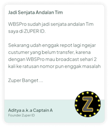 Sistem aplikasi WBSPro.ID ini tidak berafiliasi dengan WhatsApp. WhatsApp adalah merk yang terdaftar oleh WhatsApp Inc. Software Warranty yang mengikat pada sistem aplikasi ini terbatas pada modul untuk pengolahan data yang diterima dan dikirim melalui aplikasi WBSPro.ID.
